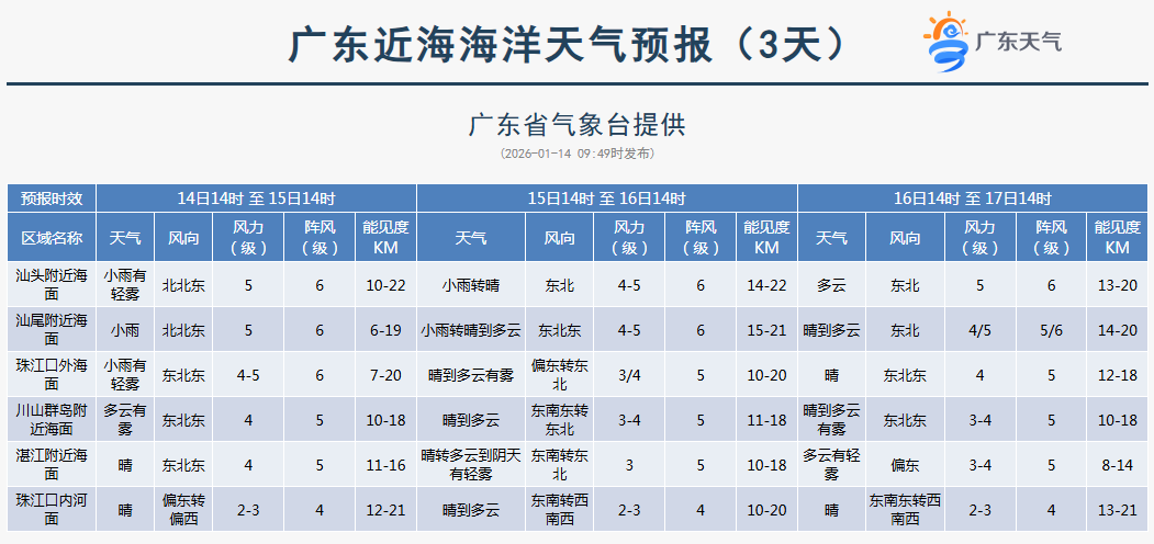 海面大风预报:14日,粤东海面和台湾海峡东北风6级阵风7级,巴士海峡和南海东北部海面东北风6~7级阵风8级;15日,粤东海面和台湾海峡东北风5~6级转5级,巴士海峡和南海东北部偏东海面东北风6级阵风7级;16-17日,巴士海峡和南海东北部偏东海面东北风6级阵风7级。
