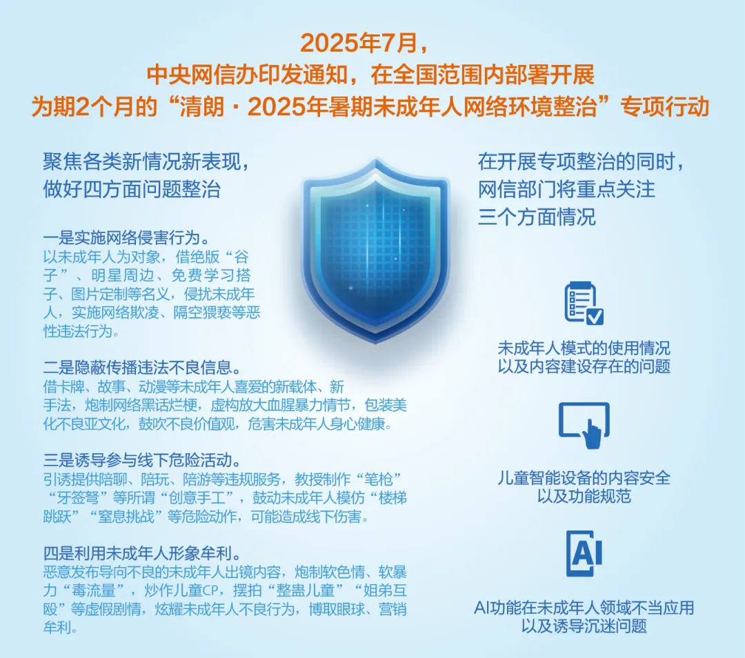 2025年7月,中央网信办印发通知,在全国范围内部署开展为期2个月的“清朗·2025年暑期未成年人网络环境整治”专项行动。