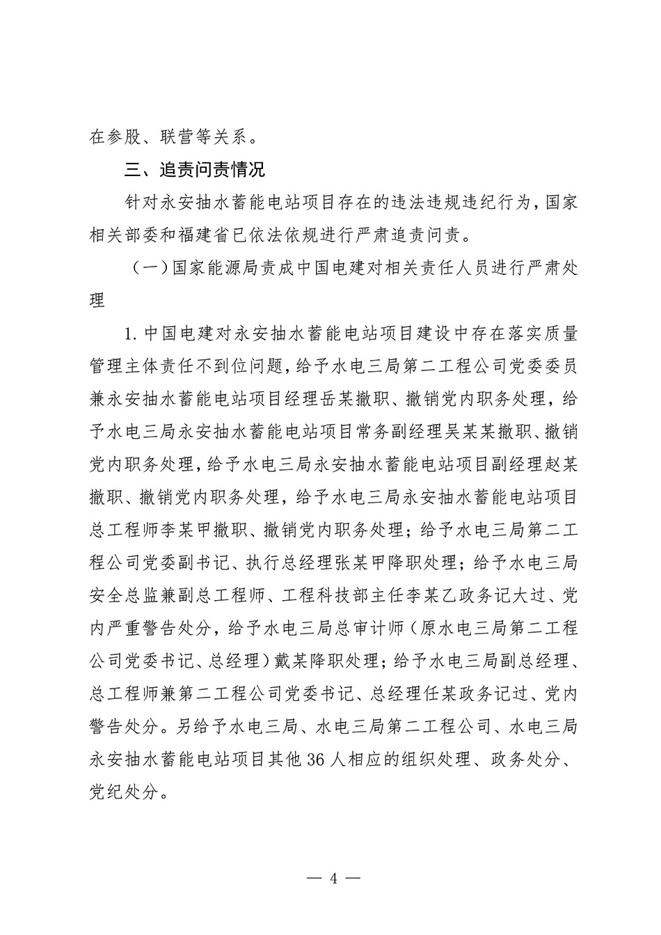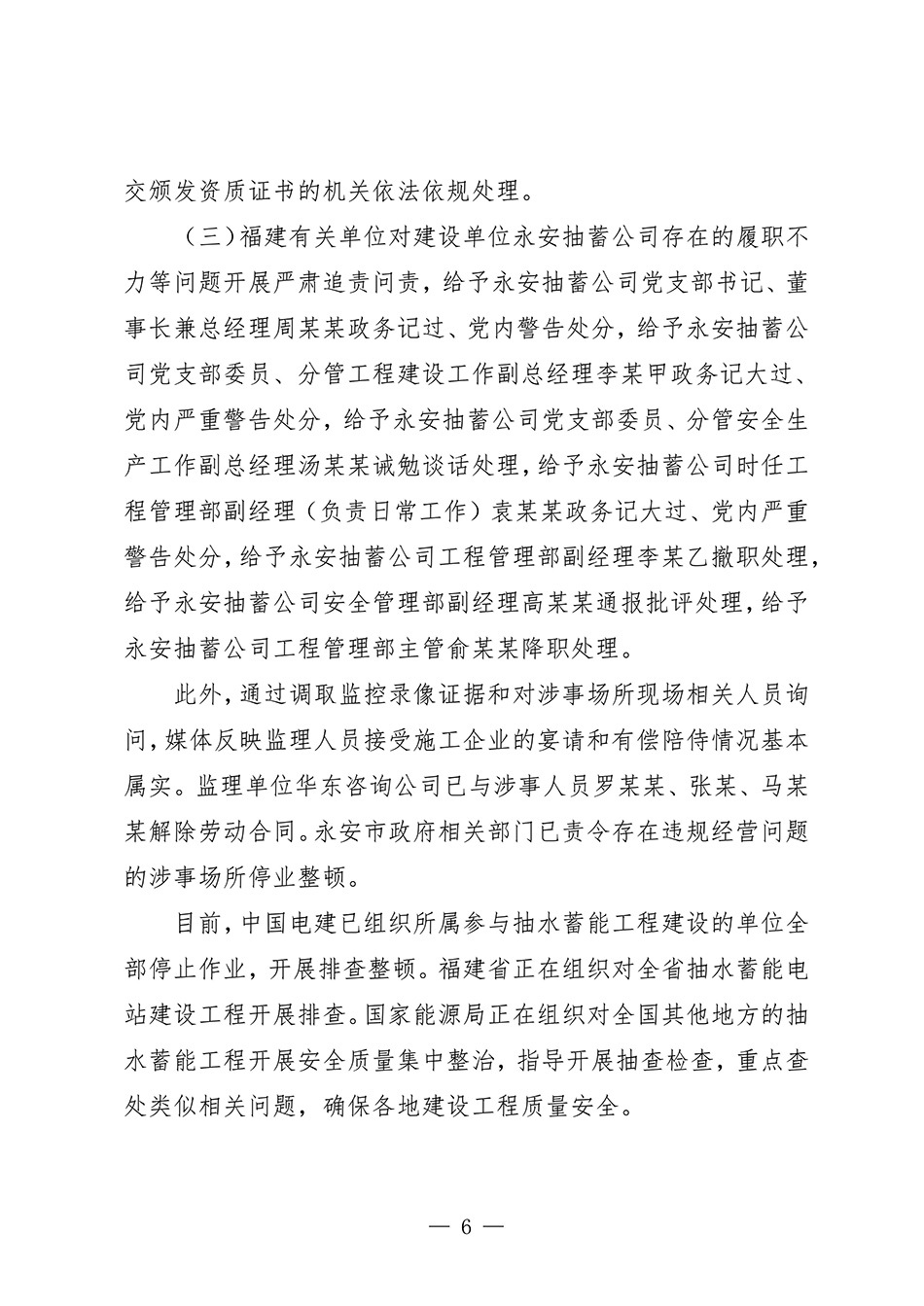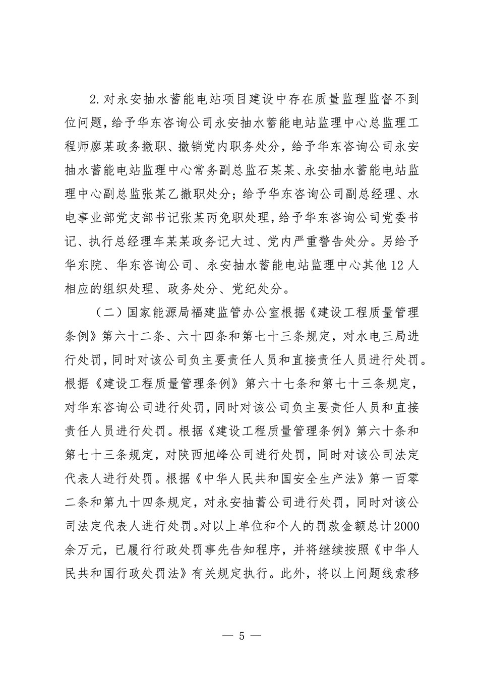 针对项目存在的违法违规违纪行为,国家能源局责成中国电建对相关责任人员进行严肃处理,水电三局、华东咨询公司的数十人受到组织处理、政务处分和党纪处分;国家能源局福建监管办公室对水电三局、华东咨询公司、陕西旭峰公司、建设单位永安抽蓄公司各单位及个人罚款金额总计2000余万元。福建有关单位对永安抽蓄公司多名管理人员作出处分。