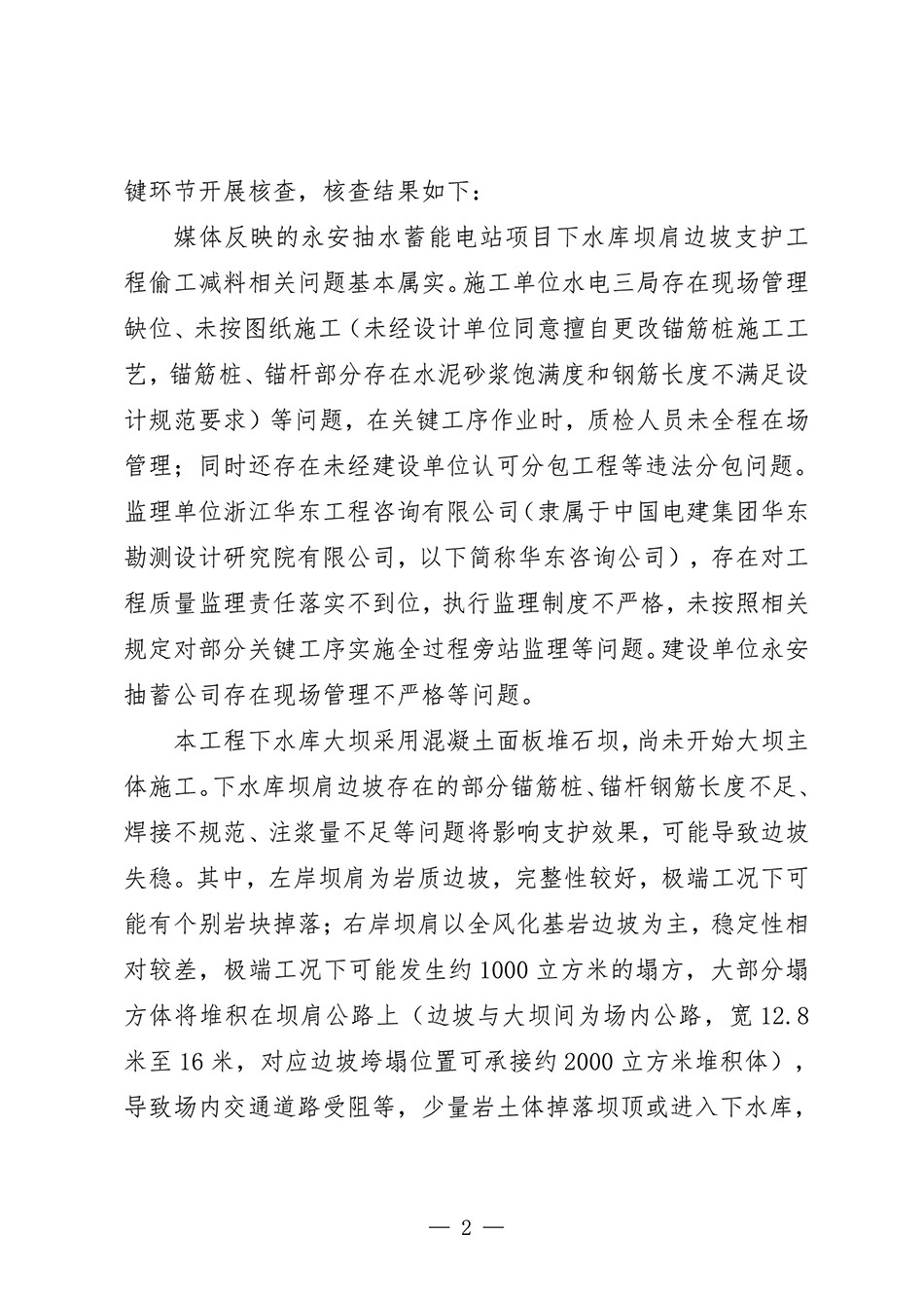 按照核查结果,施工单位水电三局存在现场管理缺位、未按图纸施工等问题,在关键工序作业时,质检人员未全程在场管理;同时还存在未经建设单位认可分包工程等违法分包问题。监理单位浙江华东工程咨询有限公司(隶属于中国电建集团华东勘测设计研究院有限公司,下称华东咨询公司),存在对工程质量监理责任落实不到位,执行监理制度不严格,未按照相关规定对部分关键工序实施全过程旁站监理等问题。建设单位永安抽蓄公司存在现场管理不严格等问题。