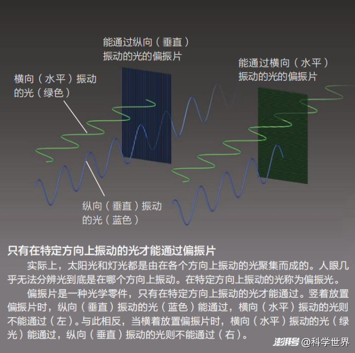 光的本质是电磁波,电场和磁场是在振动的,它们振动的方向与光的传播方向垂直(也就是说,光波是横波)。如果电场振动的方向均位于某个平面内,则说明这束光是偏振的。大部分时候,我们见到的光没有偏振,即电场在所有方向上是平均分布的。但我们也有办法来制备偏振,例如让无偏振的光去通过一个偏振片,出来的光就只剩下跟偏振片相同方向的偏振。有一种3D眼镜的原理,就是左右两个镜片分别是不同方向的偏振片,两眼通过它们看到略微不同的图像,由此产生立体感。