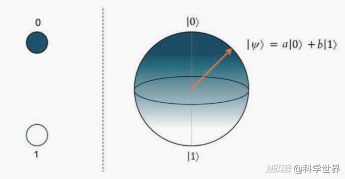 对量子比特的一个形象表示是布洛赫球(Bloch sphere),它的南极表示|1>态,北极表示|0>态。经典比特只能取这2个态,而量子比特可以取球面上的任意一点,即a|0> +b|1>,这里的a和b是2个复数,这正是为什么要用球(而不是平面的圆)来表示量子比特。正文中没有强调a和b是复数,是因为复数对许多读者会造成额外的困难,只要理解叠加态有无穷多个,就已经足以把握叠加态的大部分特征。