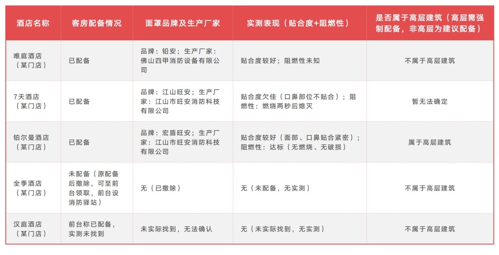 此次实测选取唯庭、7天、全季、汉庭、铂尔曼五家不同级别连锁酒店,结果显示,部分酒店配备的面罩阻燃性不佳,靠近火源后快速燃烧;部分酒店则存在客房未配备面罩的情况。