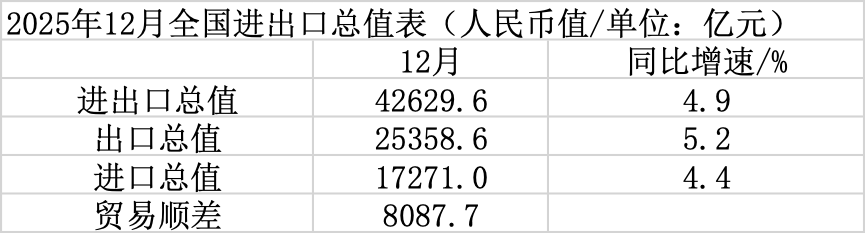 以人民币计,2025年12月,中国进出口总值4.26万亿元,增长4.9%。其中,出口2.54万亿元,增长5.2%;进口1.73万亿元,增长4.4%;贸易顺差8087.7亿元。
