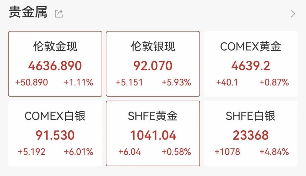 1月14日亚太交易时段,现货白银(伦敦银现)史上首次站上92美元/盎司大关,盘中最高触及92.2美元/盎司,日内涨近6%,年内涨幅突破28%。现货黄金(伦敦金现)同步刷新历史高位,达到4641.853美元/盎司,年内涨幅超7%。