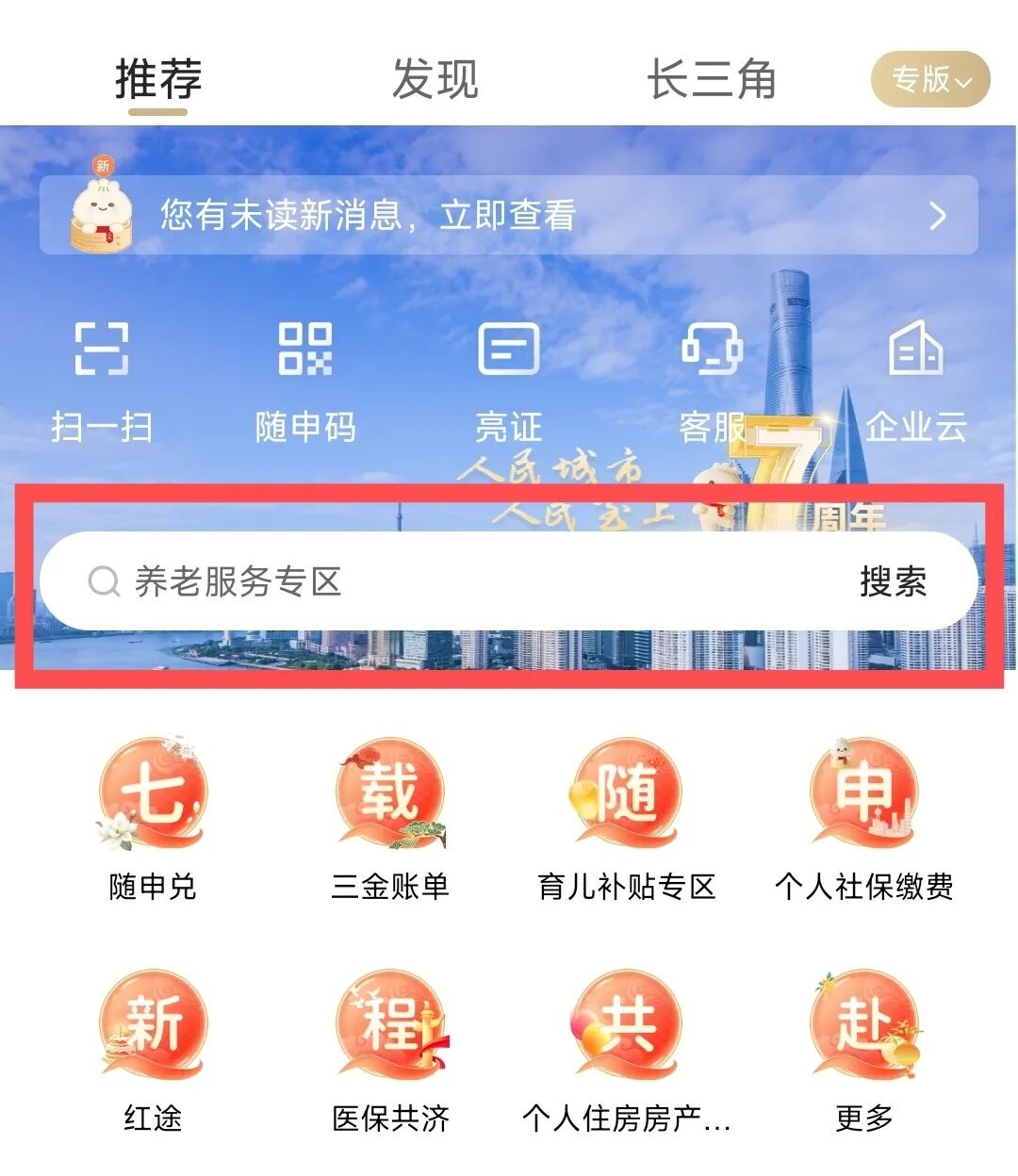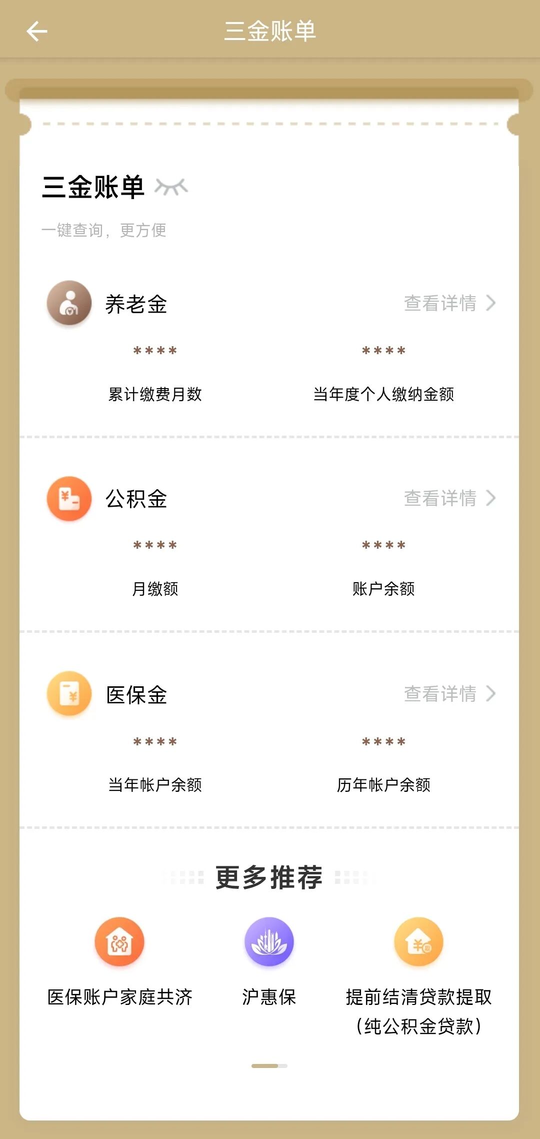 服务入口:随申办市民云APP首页搜索框搜索关键词“三金账单”,进入对应服务,即可一键查询养老金、公积金和医保金账户明细。