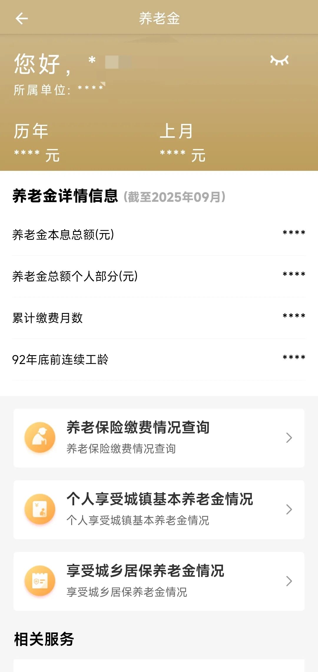 点击查看详情后,可查看养老金历年、上月、本息总额、累计缴费月数等详细信息。