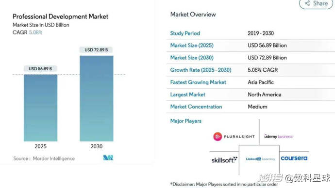 上图说明了该领域的市场规模在2025 年约 568.9 亿美元,2030 年预计达 728.9 亿美元,2025-2030 年的年复合增长率(CAGR)为 5.08%。而北美是当前最大市场,亚太地区是增长最快的市场。在集中度上,目前主要参与者包括 Pluralsight、Udemy Business、Skillsoft、LinkedIn Learning、Coursera 等平台。