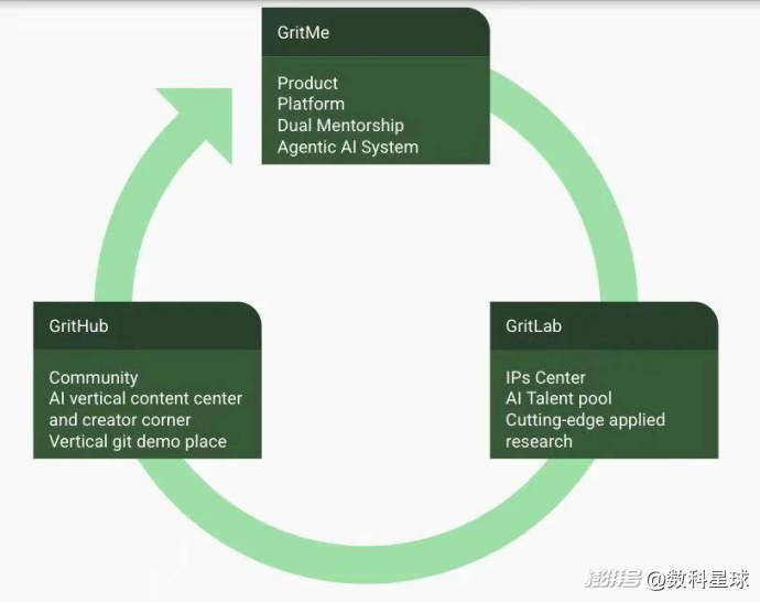 从AI+人才的产品形态来看,GritMe的核心是产品平台,提供 “双导师制”+“自主 AI 系统” 的服务;GritLab作为 IP 中心,包含 AI 人才池 + 前沿应用研究,支撑技术与人才供给;而GritHub是社区载体,涵盖 AI 垂直内容中心、创作者专区、垂直演示平台,负责内容与互动。