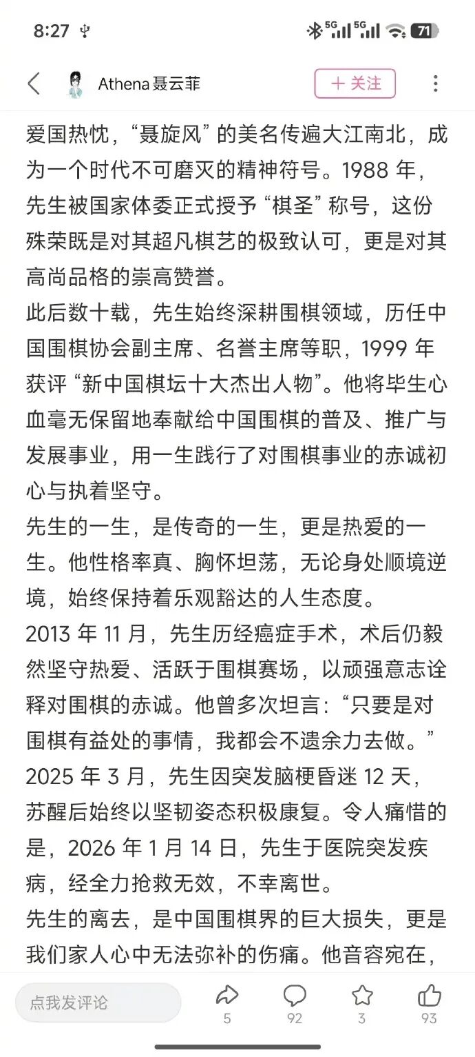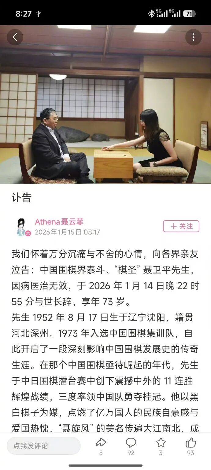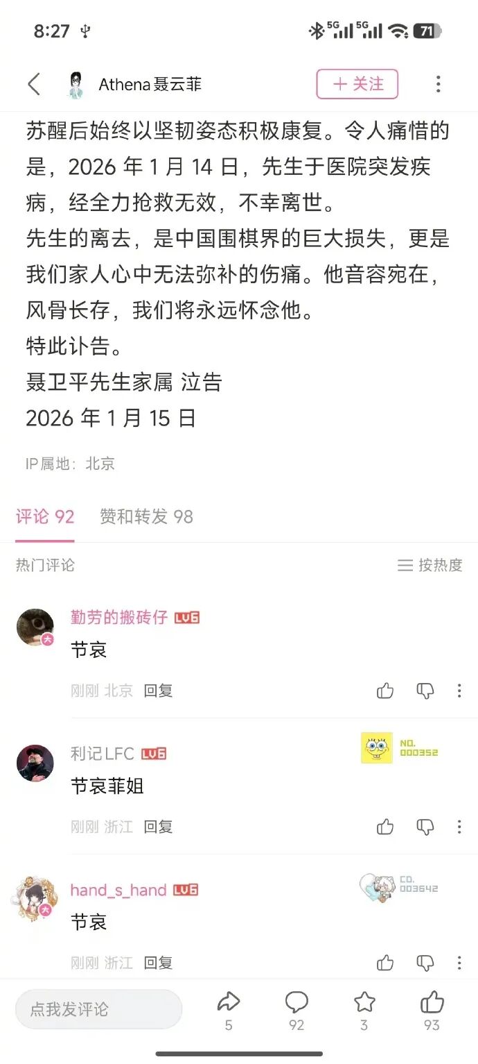 聂先生女儿在公布的讣告中提及,2013 年 11 月,聂先生历经癌症手术,术后仍毅然坚守热爱、活跃于围棋赛场;2025年3月,他因突发脑梗死昏迷12天,苏醒后始终以坚韧姿态积极康复。令人痛惜的是,2026 年 1 月 14 日,聂卫平先生于医院突发疾病,经全力抢救无效,不幸离世。