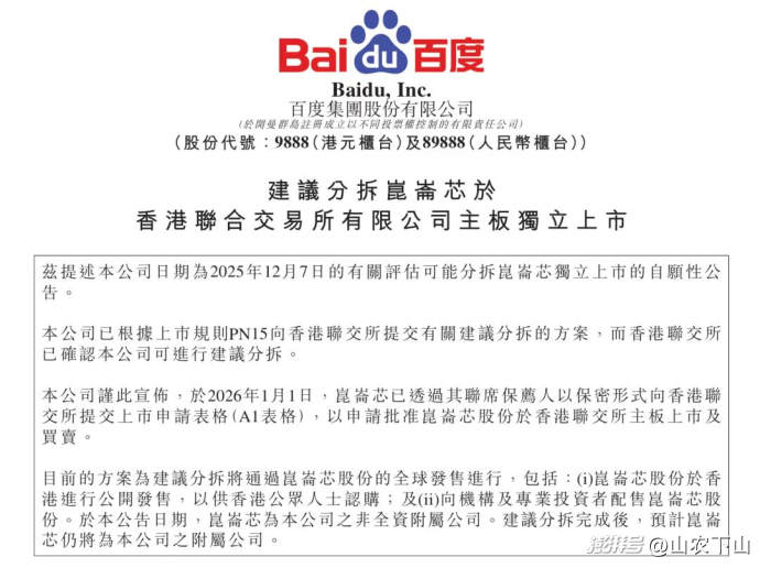 1月2日,百度发布分拆昆仑芯独立上市公告