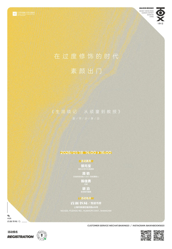 复旦大学教授、长江学者郜元宝,此次不谈学术,只携一本私人“琐记”而来。在新书《生涯琐记:从顽童到教授》中,他卸下头衔与光环,以质朴笔触回望来时路——从一个乡下孩童,到复旦讲台上的人文学者。这既是他的生命纪事,也是一代人的记忆存照。1月18日下午,郜元宝教授将与知名媒体人简昉、作家陈佳勇、本书责编胡泊于百新书局,从新书出发,探讨在专业与日常之间,人文学者如何保持思想的鲜活;从“教授”回到“个人”,会如何看待自己的来路与选择;在这个善于修饰的时代,我们能否、又如何“素颜”面对自己?