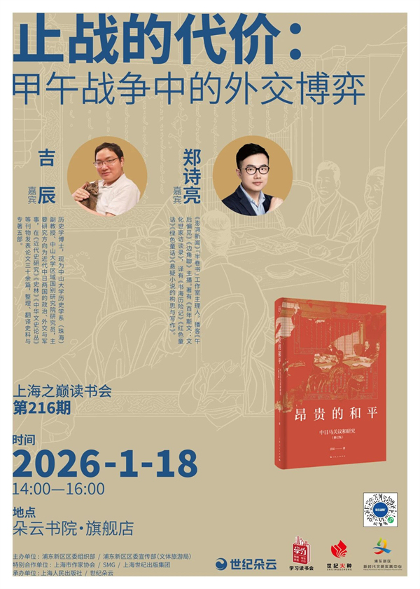 甲午战争是一场深刻改变近代中国命运的战争,而《马关条约》为这场战争画上了悲怆的句号。那么,这部条约是怎样出笼,又是怎样签订,怎样批准,怎样互换的?这样的结果是否有机会避免?《昂贵的和平:中日马关议和研究》是国内首部全面研究马关议和的著作。1月18日,本书作者吉辰、《澎湃新闻》“半卷书”工作室主理人郑诗亮将来到朵云书院·旗舰店,聊聊甲午战争中的外交博弈。