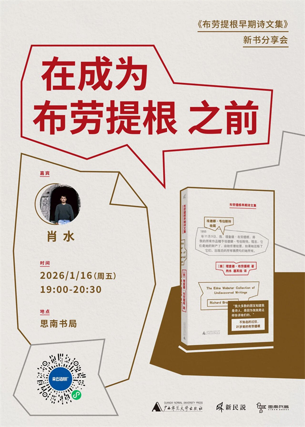 1955年,在动身前往旧金山追寻文学梦想的前夕,布劳提根将一包手稿交给埃德娜·韦伯斯特(她的女儿是布劳提根的初恋,儿子是他的好友),说:“等我出人头地了,埃德娜,这会成为你的社保。”大约十年之后,布劳提根声名大噪。之后成为“嬉皮一代”文学偶像,也是村上春树反复阅读的美国作家之一。这包手稿后来被整理出版,成了《布劳提根早期诗文集》。其中包含诗歌和短篇小说,几乎囊括了布劳提根21岁前的全部创作。1月16日晚,《布劳提根早期诗文集》译者肖水将来到思南书局,聊一聊成为文学偶像之前的布劳提根,诗人“过去的秘密”。