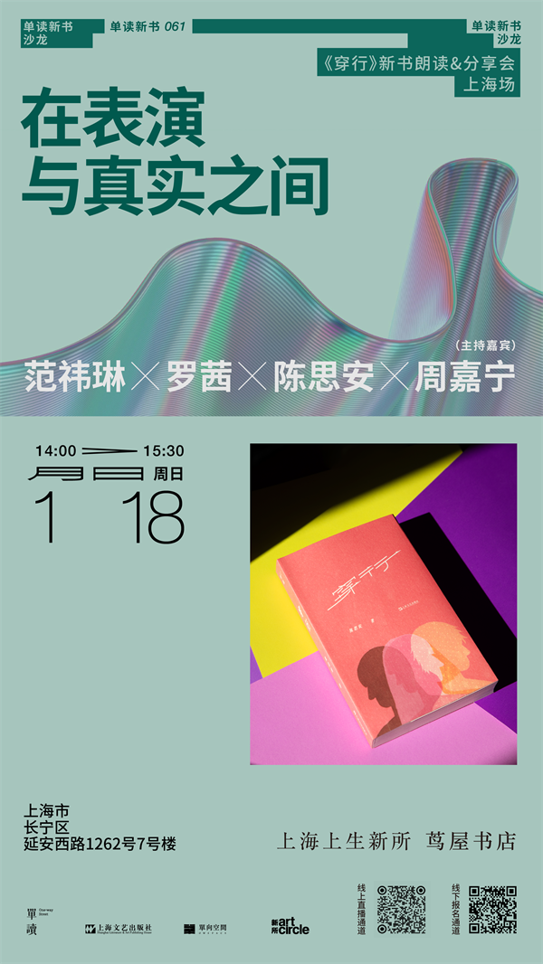 舞台的魔法在于,它看似为生活和戏剧划出一条泾渭分明的分界线,但演员的演绎诠释,又让观众沉浸在真假莫辨的世界里。正如《穿行》中写到的戏剧演员庄一尘所言,在台上,“年代不重要,种族不重要,现在连性别也不重要了,但我们投放在表演上的一切,就是我们这个人啊!”1月18日,我们邀请《穿行》作者、戏剧编剧、导演陈思安,与演员范祎琳、导演罗茜、作家周嘉宁来到上海上生新所茑屋书店,在朗读演绎新书片段后,她们会从自己在剧场和生活中的切身经验谈起,聊聊表演与真实之间的距离。