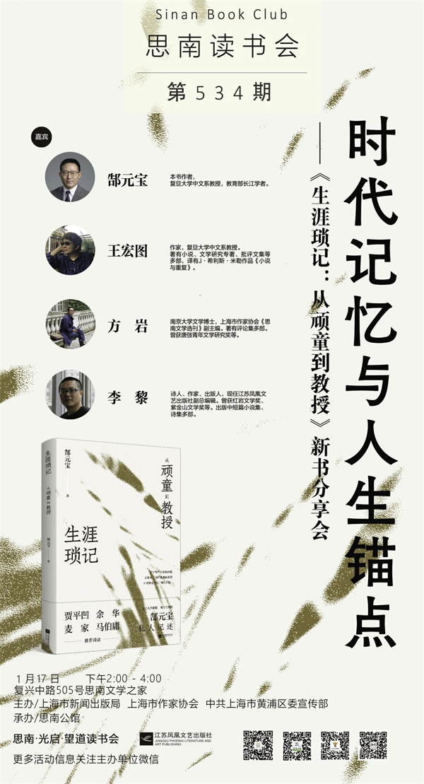 本次思南读书会,我们邀请到复旦大学教授、长江学者郜元宝,携其全新散文集《生涯琐记:从顽童到教授》做客现场。在这部“课后闲聊录”中,郜教授以质朴幽默的笔触,首次系统回顾其从皖南乡村“顽童”到复旦讲台学者的独特生命轨迹。郜元宝教授将与三位特邀嘉宾一同,引领读者穿越时光,重审那些塑造自我的关键瞬间。我们期望,这不仅是一场新书分享,更是一次关于如何打捞个人记忆、在时代洪流中锚定自我价值的真诚对话。