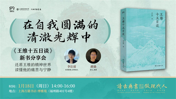 王维的真实面容一直被湮没在世家公子、美少年、音乐家、诗佛、“诗中有画、画中有诗”这些固化标签之中。细解王维生平、时代、亲交、情感、宗教、音乐、绘画、诗艺,才能还原王维的精神世界,试图感受他对自我生命的安放,读懂他的痛苦与无奈,以及由此而生发的宁静平和。1月18日,《王维十五日谈》作者、青年诗人李让眉,诗人、译者胡桑,将共同做客上海古籍书店,与读者一起聊聊王维与当代诗歌和当代生活的关系,阅读王维之于我们当代人的意义。