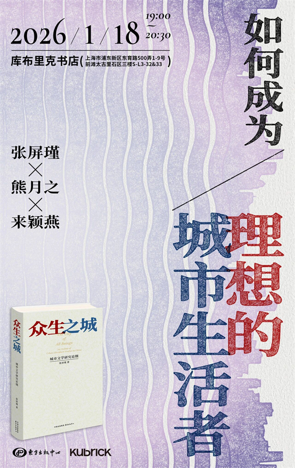 当Citywalk 成为日常,当“城市孤独症”冲上热搜,我们在钢筋水泥的丛林里既渴望归属感,又恐惧被规训,我们或许也曾追问:理想的城市生活,究竟是什么模样?1月18日晚,我们将在前滩库布里克书店迎来一场关于城市、文学与生活的深度对话。我们邀请到《众生之城:城市文学研究论纲》作者张屏瑾、著名历史学家熊月之、青年评论家来颖燕,与读者共探百年城市文学中的生存智慧,共同解锁成为理想城市生活者的密码。