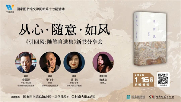 《引回风:随笔自选集》是李敬泽随“心”而至、由“意”牵引的书写见证。在浩荡的时代风潮与幽微的个人心绪之间,他以文字为引,召唤、引领那回旋往复的精神气流。它关乎记忆、洞见、历史碎影与当下现实,更关乎一种“从心所欲”却深邃有力的自由书写。1月16日下午,李敬泽将携手两位重量级嘉宾:著名作家、茅盾文学奖得主毕飞宇,非虚构写作代表人物梁鸿,相聚国家图书馆。本次活动由知名媒体人魏冰心主持,他们将打破创作边界,从这部时间之书出发,共话“从心·随意·如风”的可能,探讨我们要如何才能涵养“如风”般的通透心境,方能在这变动不息的世界中,举重若轻地“引风”而行。