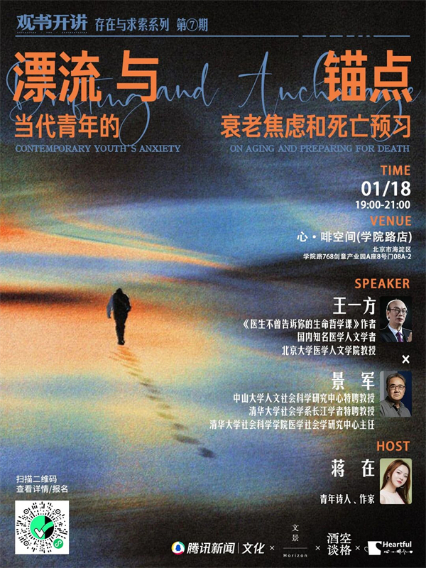 在崇尚年轻与效率的现代社会,衰老似乎成了一种需要被极力避免的“失败”。20多岁的年轻人开始自嘲“脆皮”,30岁的职场人陷入“初老”恐慌。这种“早熟的焦虑”背后,掩藏着我们对身体失控的无助,以及对“如何有尊严地走向终点”这一命题的认知空白。1月18日晚,我们特别邀请《医生不曾告诉你的生命哲学课》作者王一方教授和清华大学社会学系景军教授两位嘉宾,基于医学与社会学的双重视角,一方面从医学与临床经验出发,分析衰老与死亡背后的生理与心理机制,给出可操作的“解药”——如何科学面对死亡焦虑?如何在疾病、失能来临前做好现实准备?另一方面,也从社会学角度追问“原因”:为何现代人更怕衰老与死亡?制度、家庭结构与文化观念如何加剧我们的孤独与恐惧?我们还特别邀请到青年作家、诗人蒋在老师作为本次活动的主持嘉宾,共同分享衰老和死亡焦虑背后的生命哲学。
