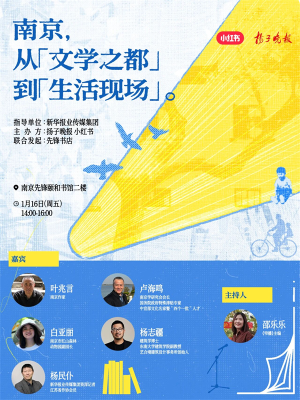 作为来自中国的“世界文学之都”,南京的时光里流淌着千年文脉,而它的每一次呼吸,饱含着一点一滴、热气腾腾的市井生活。1月16日,南京著名作家叶兆言、南京学研究会会长卢海鸣、南京市红山森林动物园副园长白亚丽、东南大学建筑学院副教授杨志疆和新华报业传媒集团资深记者杨民仆将来到先锋颐和书馆,与担任主持人的《窄播》主编邵乐乐一起,带领读者穿行于文学、历史、自然、建筑与街巷的故事之间,探寻南京为何能如此独特——它既承载着厚重的过去,又始终生长在生动鲜活的当下。