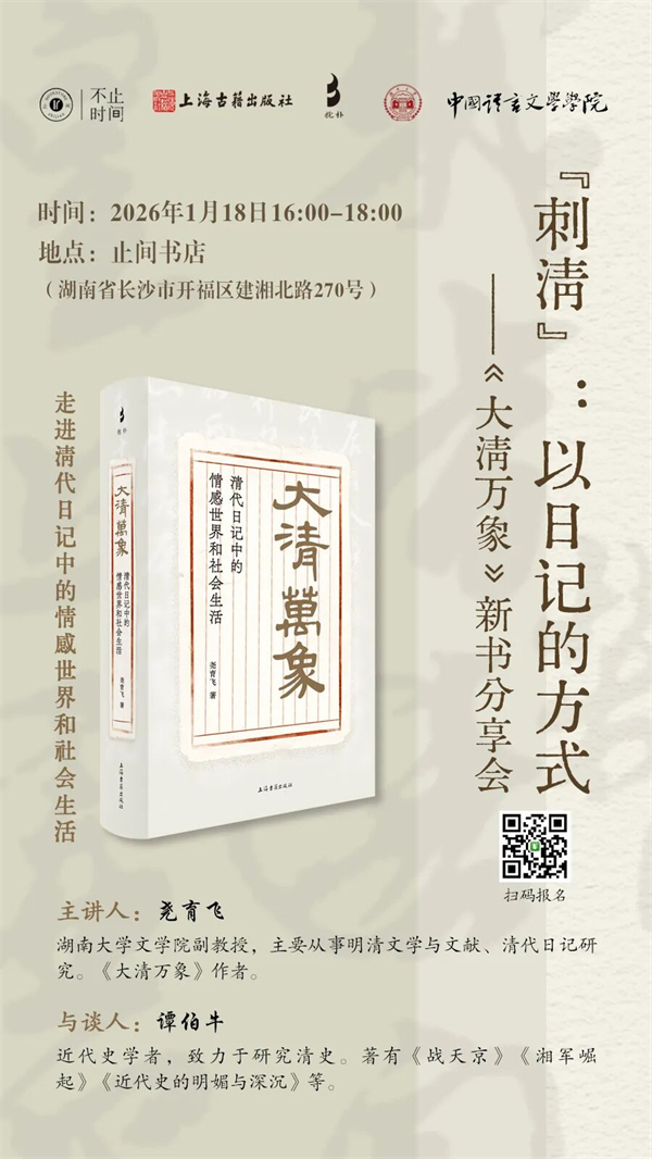 清代是中国古代日记的集大成时期,日记写作蔚然成风,上至达官显贵,下至贩夫走卒,人人皆可在纸墨间落印自己的观察、思考与情感。个人书写成为时代风貌的生动切片。1月18日,湖南大学文学院副教授、《大清万象:清代日记中的情感世界和社会生活》作者尧育飞将携新书做客止间,并与知名近代史学者、清史研究者谭伯牛以“‘刺清’:以日记的方式”为题展开对谈。