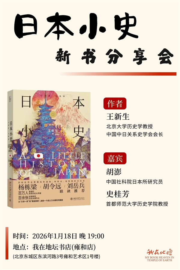 《日本小史》以作者、北京大学历史学系教授王新生在喜马拉雅的音频课程“世界历史大师课”为基础整理修订而成,以30个主题串联起日本从史前当代的历史,涉及政治、经济、文化、艺术等各方面的内容。本周日晚,我们邀请王新生教授与胡澎、史桂芳两位嘉宾一起做客我在地坛书店(雍和店),分享新书。
