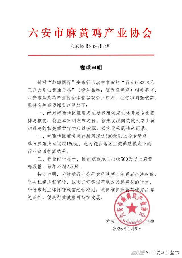 1月9日,安徽省六安市麻黄鸡产业协会发布的《郑重声明》被普遍视为引爆此次舆情的导火索,据极目新闻报道“经对皖西地区麻黄鸡主要养殖供应主体开展全面摸排与核实,暂未发现向该款大别山黄油母鸡的相关经营方供应过货源,双方无采购往来记录。”