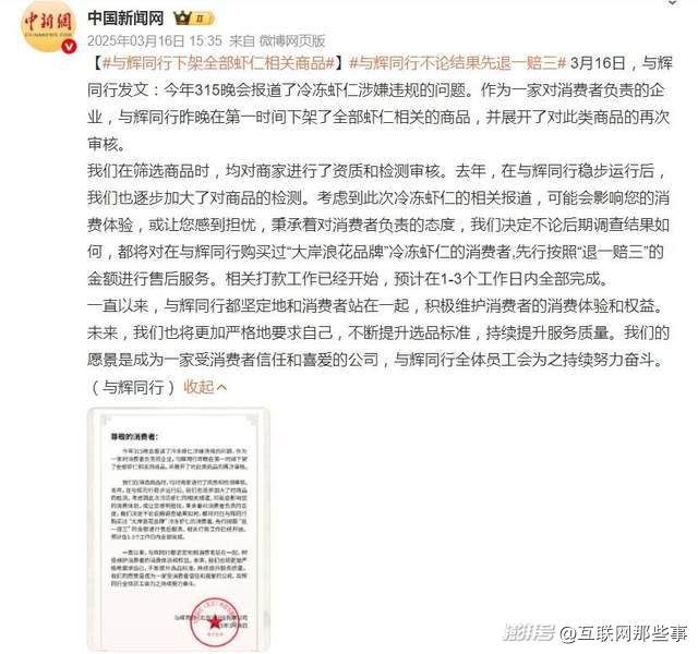2025年3月,其销售的冷冻虾仁因被315曝光磷酸盐超标问题引发公众普遍关注,最终与辉同行对相关产品做出下架、并进行了“不论结果退一赔三”的处理。