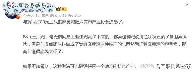 值得一提的是,网络平台上,也有不少大 V表达了对该起事件的看法,他们大多持鲜明的否定态度,有认为“与辉同行全程装哑巴,选品翻车,真的败好感”,有认为“如果不加管制,这种做法可以摧毁任何一个地方的特色产业”,还有的发出“83块钱3只鸡都敢吃?……”的调侃。