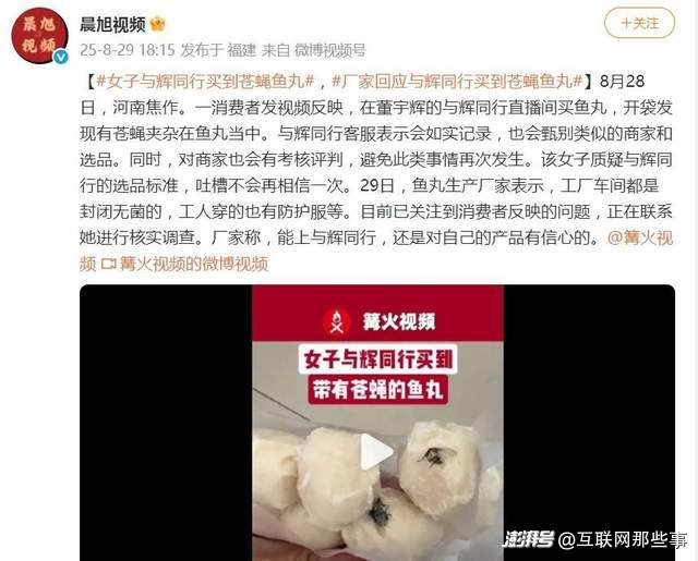 2025年8月,河南焦作一消费者发视频反映,在董宇辉的与辉同行直播间买鱼丸,开袋发现有苍蝇夹杂在鱼丸当中。