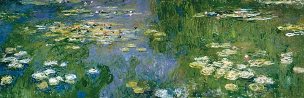 这些珍贵的花朵漂浮着,在《睡莲》中,那蓝绿色、流动如液体般的水面上缓缓游移,几乎察觉不到它们的运动。画面唤起一种梦幻般的安适感,仿佛世界放慢了速度,甚至时间本身也彻底停驻。莫奈本人曾将这种体验类比为诗歌与音乐,他提到法国诗人马拉美,也提到德彪西——后者正是在1905年创作了《水中的倒影》。