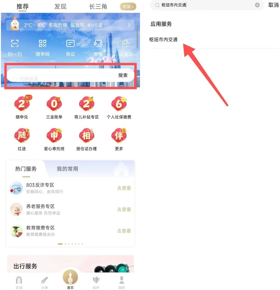 打开“随申办市民云”APP,首页搜索栏输入「枢纽市内交通」,并点击进入专区。