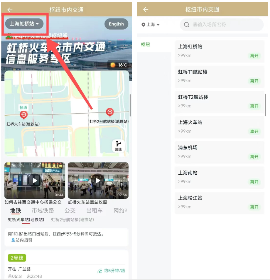 进入专区后,在界面上可以看到左上角的选站按钮,点开选站按钮即可看到上海的各大站点,选择「上海虹桥站」。