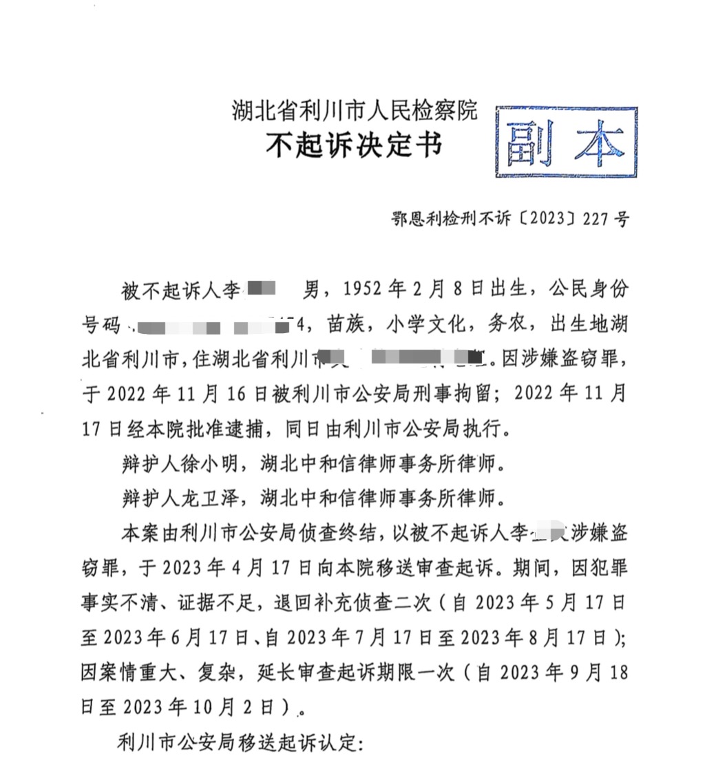 李高成提供的三份不起诉决定书显示,2023年9月28日,湖北省利川市人民检察院向三人同时作出不起诉决定,检察院认定,经审查并二次退回补充侦查,仍然认为现有证据无法认定三人犯意产生时间、作案方式及犯罪金额,利川市公安局认定三人涉嫌盗窃罪的事实不清、证据不足,不符合起诉条件。同日,李高成与二儿子李康被释放,此时二人已均被羁押316天,李高成大儿子李宇军此前于2023年6月13日被改为监视居住,释放前已被羁押209天。