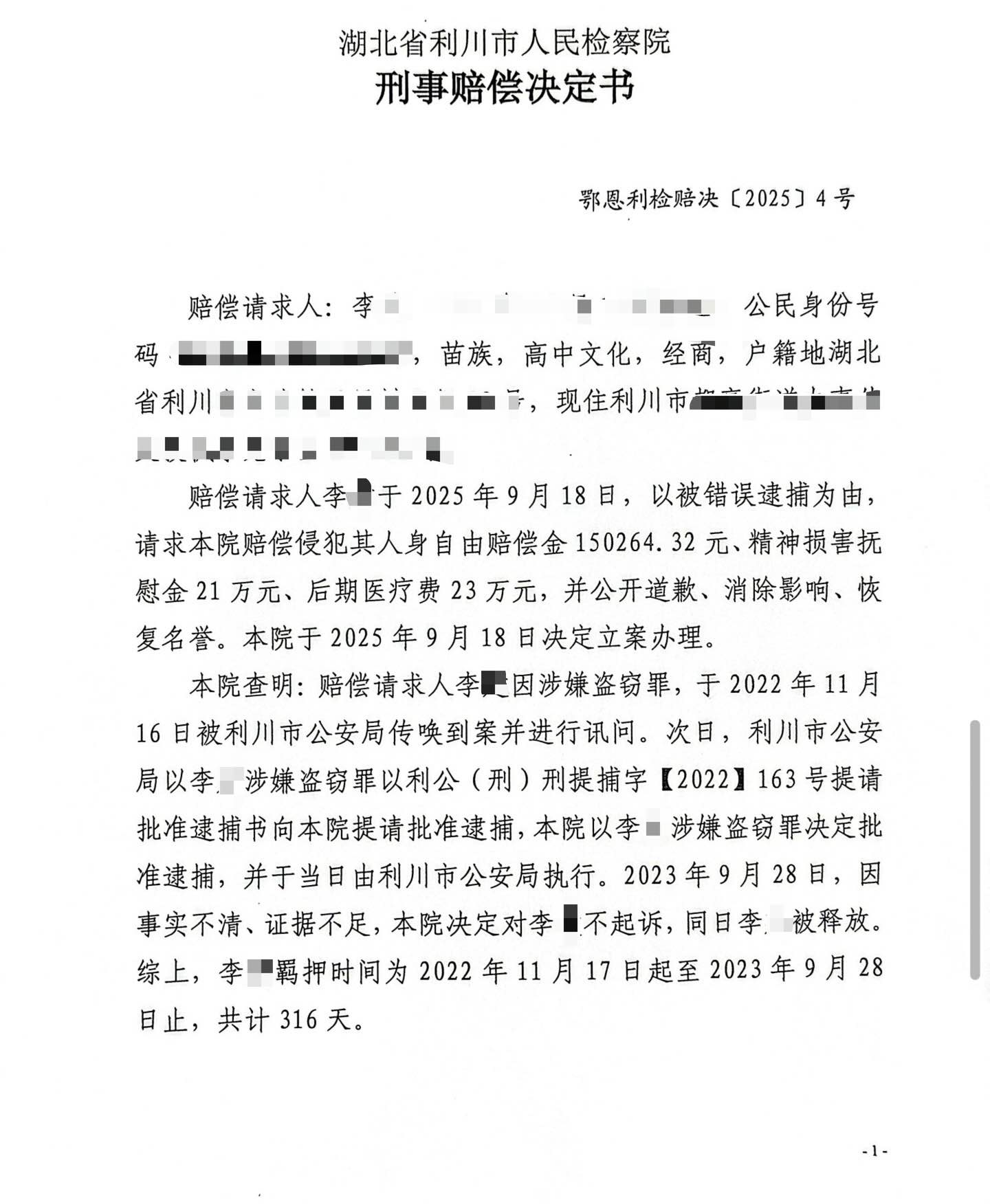 2025年11月18日,利川市人民检察院对李康出具刑事赔偿决定书