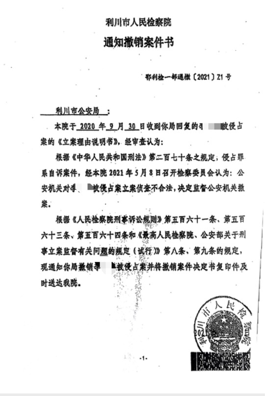 2021年6月8日,利川市人民检察院向利川市公安局出具通知撤销案件书