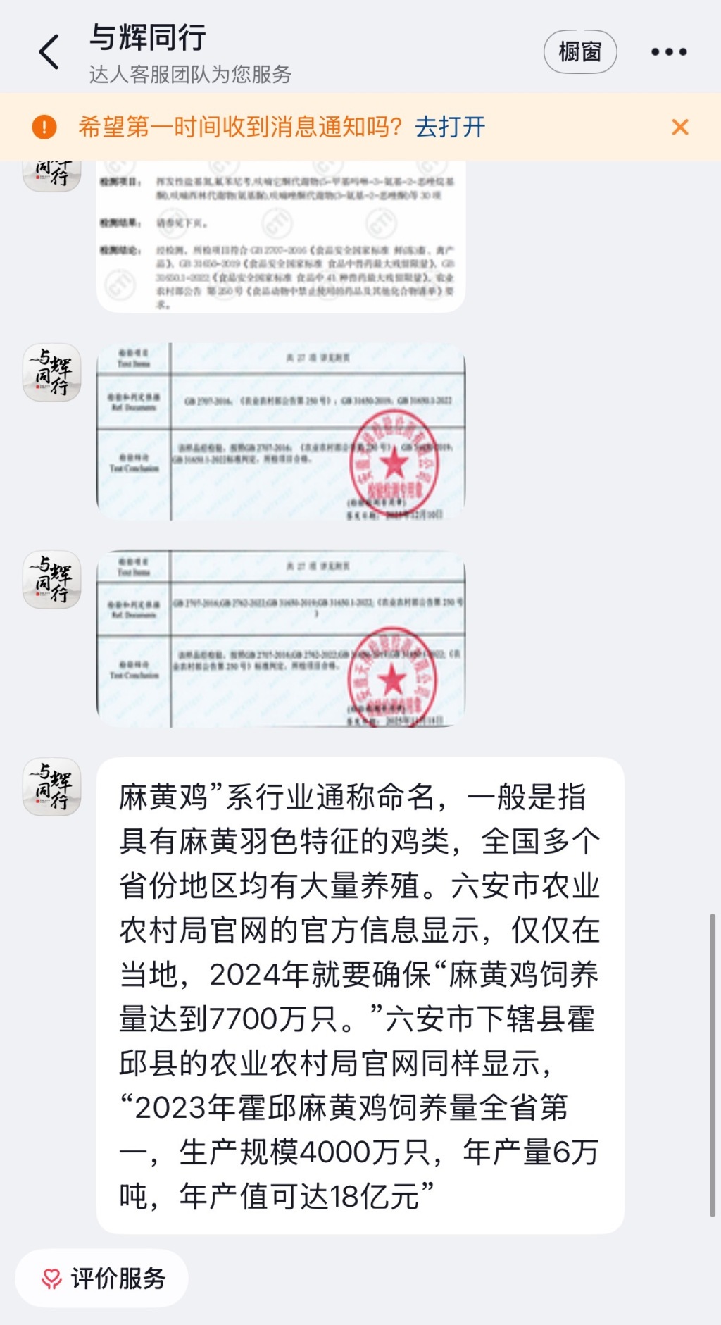 1月15日晚上,澎湃新闻以消费者身份反复询问售卖的鸡是否为麻黄鸡、皖西麻黄鸡?“与辉同行”客服未正面回应,仅称麻黄鸡一般指具有麻黄羽毛特征的鸡类,全国多个省份地区均有大量养殖。