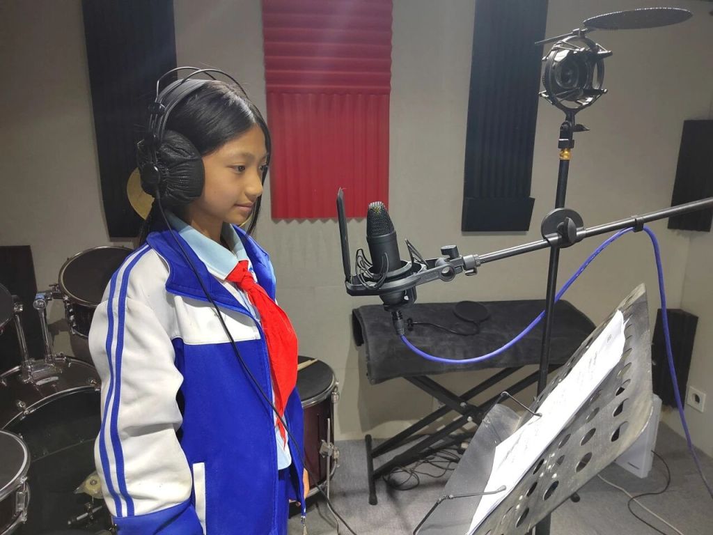 录制当天,面对陌生的录音室和麦克风,孩子们难免感到紧张。陪同指导歌唱的美丽中国支教老师悉心引导:“想象自己站在星光下、站在山野间、站在所有听得见歌声的人心里。”熟悉的场景释放了紧张感,孩子们仿佛回到了课堂、回到了操场,就像在平常岁月里,真实地吟唱出心中的旋律。