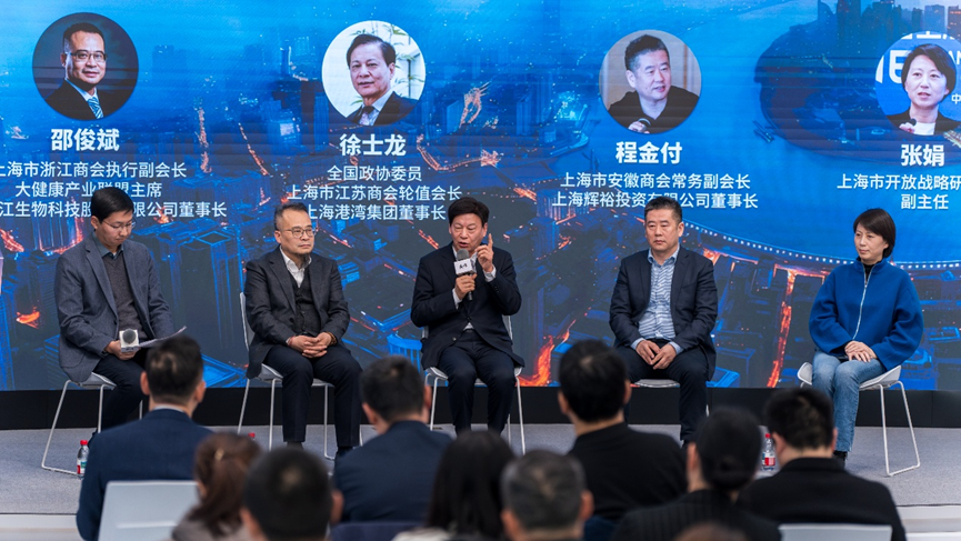 圆桌讨论环节主持人上海国际问题研究院世界与上海研究中心执行主任、研究员王玉柱(左一),互动嘉宾从左到右依次为上海市浙江商会执行副会长、大健康产业联盟主席、上海之江生物科技股份有限公司董事长邵俊斌,上海市江苏商会轮值会长、上海港湾集团董事长徐士龙,上海市安徽商会常务副会长、上海辉裕投资有限公司董事长程金付,上海市开放战略研究中心副主任张娟。