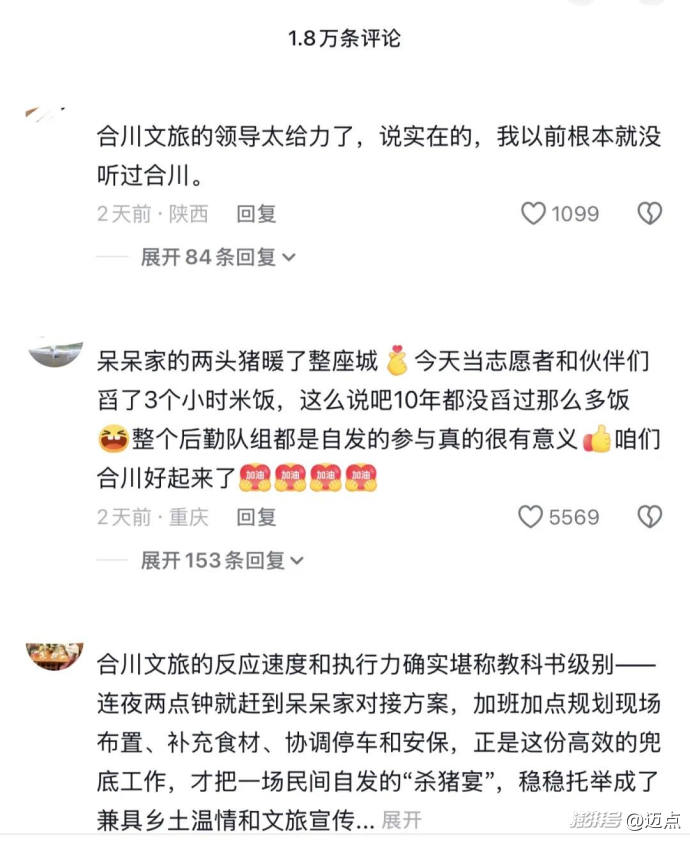 合川文旅就是一个典型的例子,呆呆的视频刚火不到24小时,当地文旅部门就带着钓鱼城景区门票、合川桃片糕赶到现场,一边帮着招呼游客、搭手干活,一边连夜梳理出城区及镇街的“刨猪汤打卡点”,附上地址和联系电话,让自发而来的游客有处可去、有景可逛。