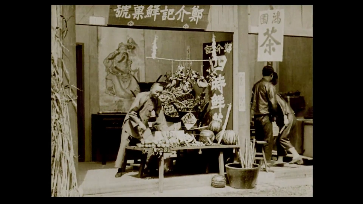 第一段是1901年英国战地记者在南京路拍的街景,他本意是拍摄军警,却留下了店铺的招牌。那时摄影机只能用固定机位,影像时长也很短,但已能窥见早期商业的痕迹。第二段来自1917年的长纪录片《经过中国》,由一位美籍俄裔犹太人拍摄。其中清晰记录了当时远东最大的菜场——虹口三角地菜市场,摊位林立、招牌纷杂,充满市井活力,与今天整齐划一的商业街完全不同。第三段是中国现存最早的剧情片《劳工之爱情》(1922年),片中木匠改行卖水果,竟用锯子切西瓜、砍甘蔗,夸张又滑稽;还有贴近市民生活的裁缝店和“老虎灶”,都是商业文明的毛细血管。第四段是1930年代静安寺庙会,黄包车、摩托车、小轿车混行,摊位上有竹篮、藤椅,也有洋袜、化妆品;中英文招牌并置,人们讨价还价,热闹非凡。这体现了上海商业的多元、开放。