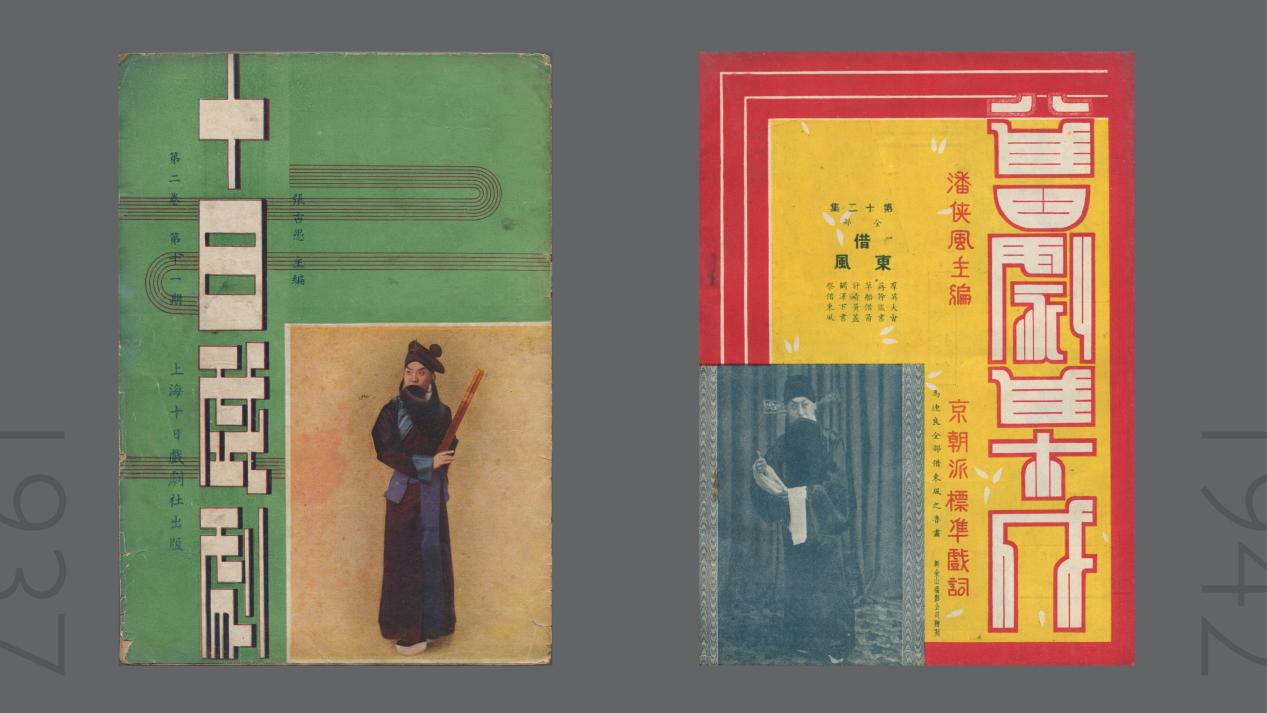 再来对比两本专业杂志——上海张古愚主编的《十日戏剧》与京津潘侠风的《旧剧集成》。前者封面简洁典雅,做了减法;后者略显繁复,甚至有皇家榫卯的意味。这反映出“海派”与“京派”对装饰艺术的理解差异。尤其《十日戏剧》对“剧”字的化繁为简的处理,展现了早期设计师对汉字美术字体的大胆探索。