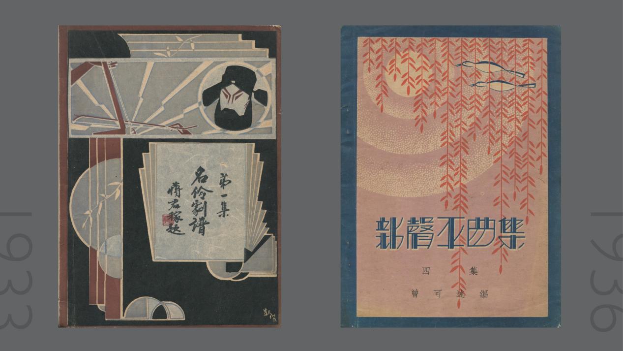 首先是1933年《名伶剧谱》和1936年《新声平曲集》,均为江浙戏迷自费编辑的京剧曲谱,在上海完成印刷和发行。前者的封面几乎全是几何图形:拉胡琴处放射出尖利光芒,像京胡的声音;下方圆形、半圆让人联想到锣鼓镲片。虽无章法,却生动传递出京剧的热闹感。后者更平衡,字体竖粗横细,明显受英文字体影响。