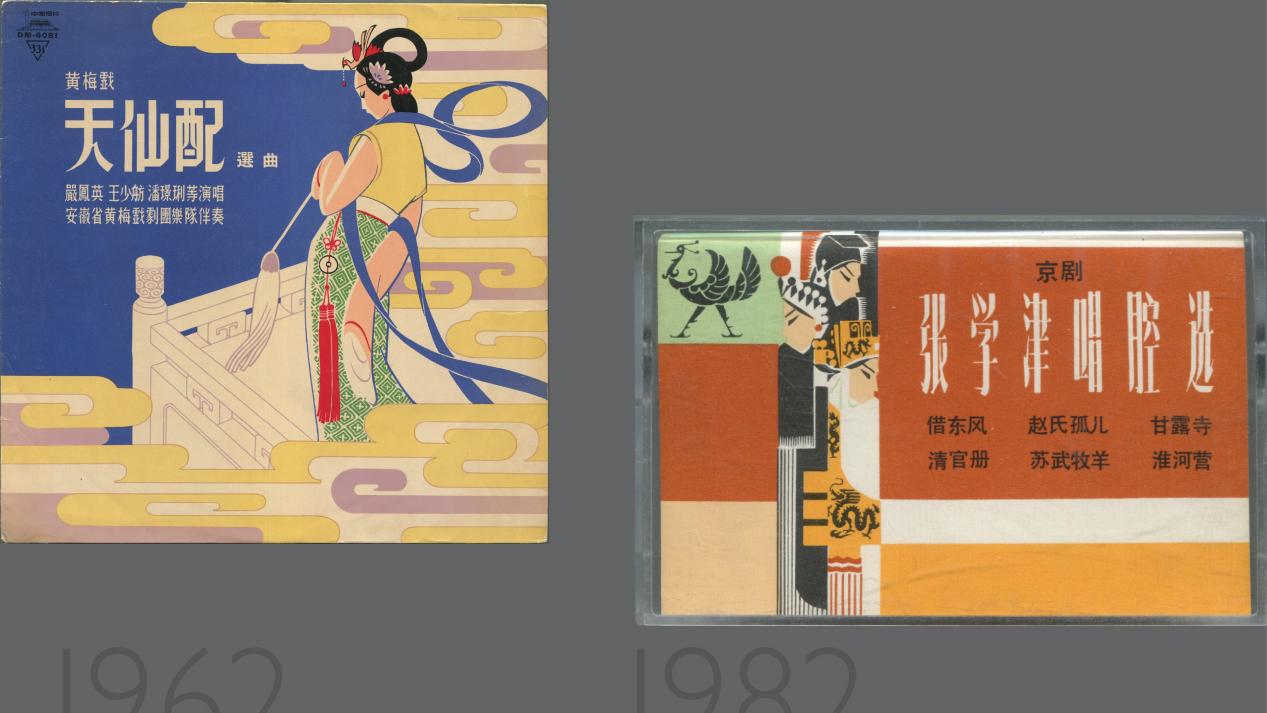 最后,在1949年后设计中的几何风格弱化,但海派设计师仍不乏努力,丁浩1962年设计的黄梅戏《天仙配》唱片、蔡振华1982年设计的《张学津唱腔选》录音带封面都用简约图形保留了现代感。