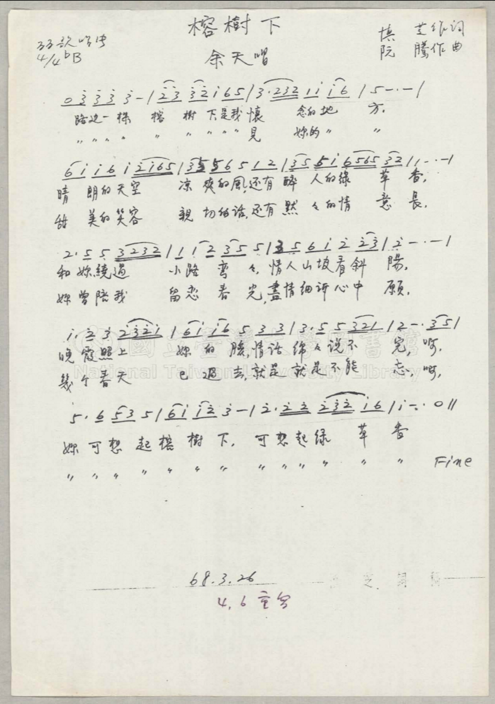 台湾大学图书馆所藏的“慎芝与关华石手稿资料”中,有当年慎芝为“榕树下”填词的草稿一枚。从这枚草稿的时间落款来看,慎芝是在1979年3、4月间填出这首《榕树下》的。但在草稿的右上角,作曲者却标注为“阮腾”,这个名字显然是从原作曲者远藤实的名字中化用而来。