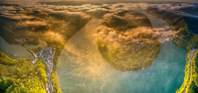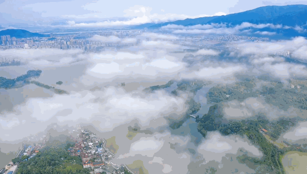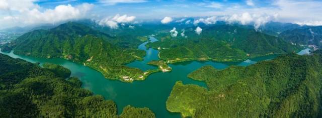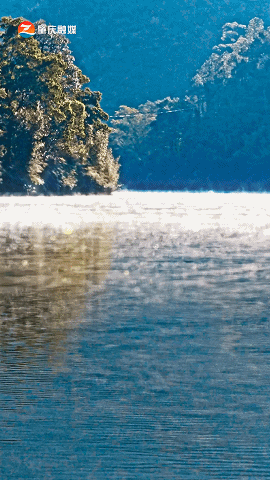 在湖面铺展成流动的纱幔,轻抚湖面划开涟漪,将青翠的山峦与碧绿的湖水包裹其中。