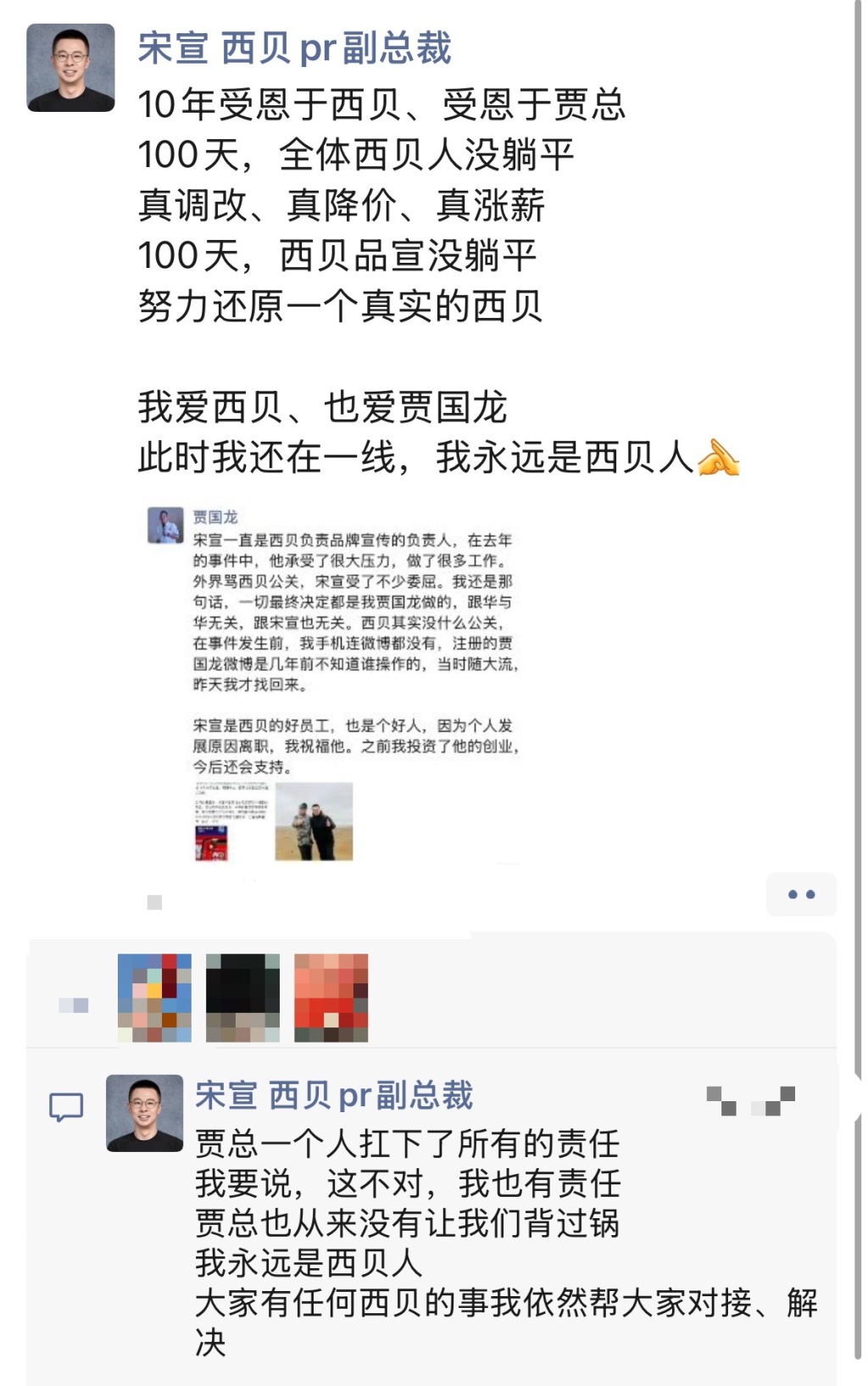 宋宣还留言称,“贾总一个人扛下了所有的责任,我要说,这不对,我也有责任;贾总也从来没有让我们背过锅,我永远是西贝人,大家有任何西贝的事我依然帮大家对接、解决。”