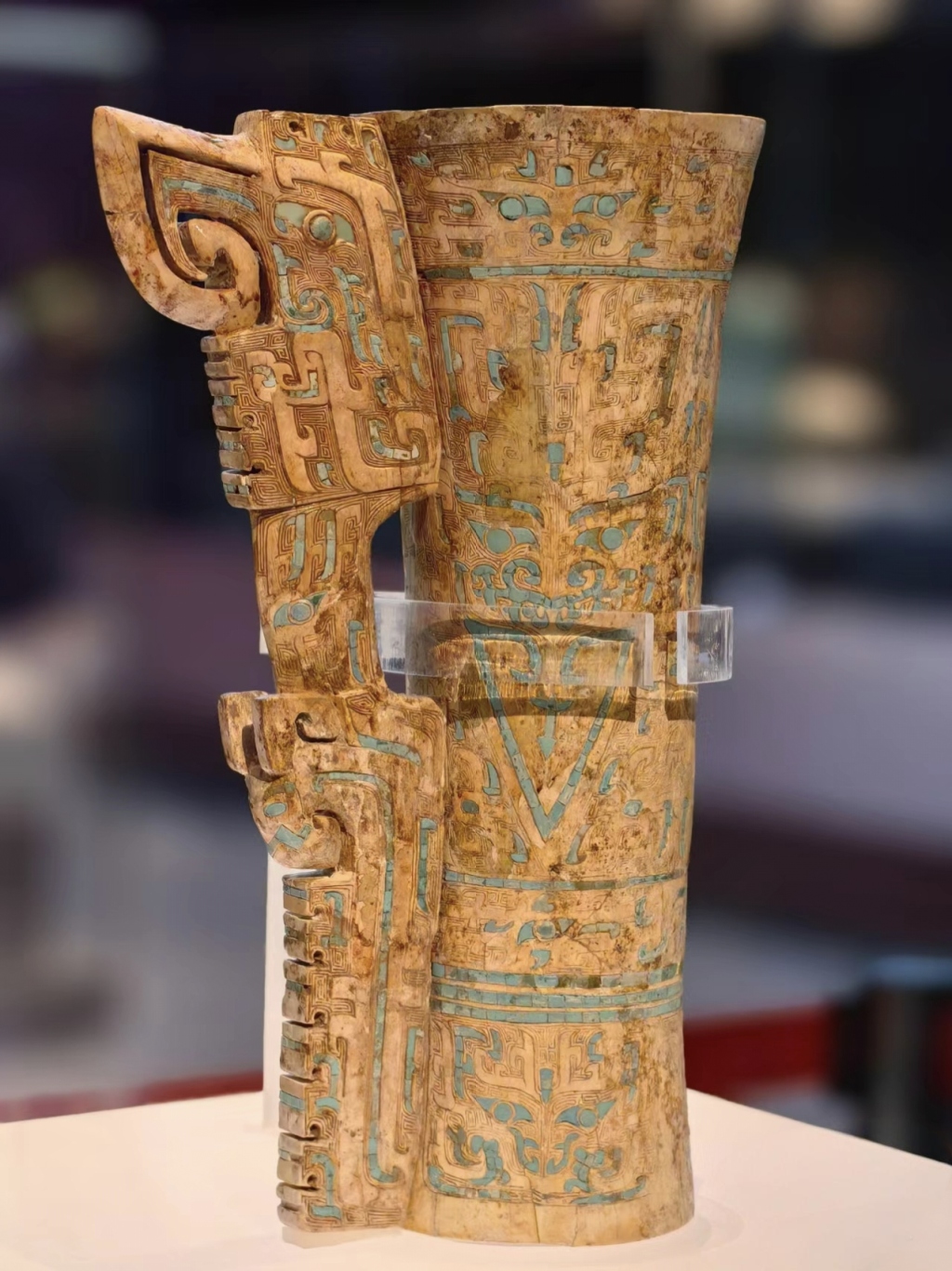 嵌绿松石象牙杯作为饮酒器,由武丁赐予妇好。这件器物综合了立体、线刻、浮雕、镶嵌等多种工艺,表现了巧妙的艺术构思,为商代象牙雕刻中最为名贵的精品,被列入《首批禁止出国(境) 展览文物目录》。