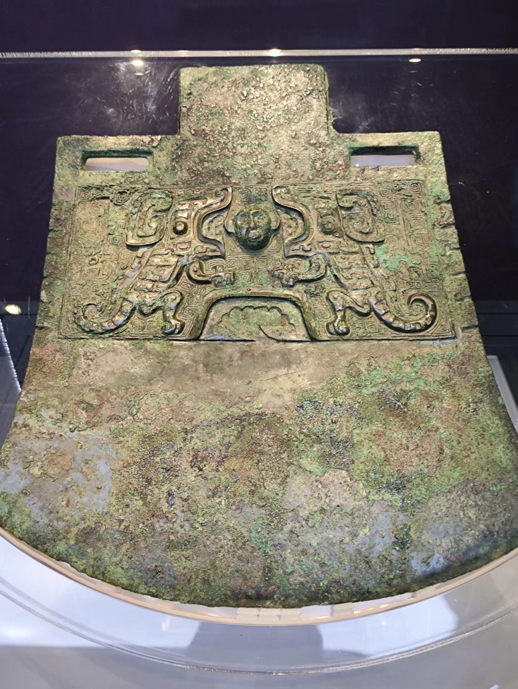 妇好墓出土的妇好虎食人纹铜钺,现藏中国考古博物馆。通长39.5厘米,刃宽约37.3厘米,肩宽28.9厘米,重达9千克。钺上饰双虎扑噬人头纹,还有“妇好”二字铭文。这件妇好铜钺并非实战兵器,而是妇好统帅的象征物。